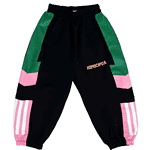 - Design : Pantalon avec des couleurs attrayantes – noir avec des touches de vert et de rose – et des bandes décoratives sur les côtés.