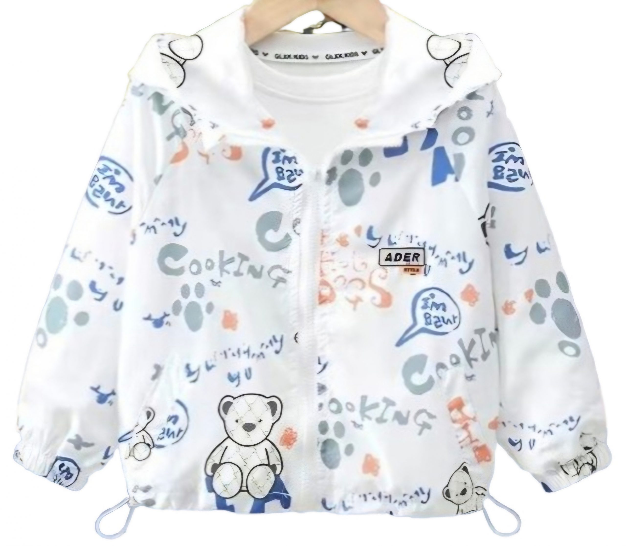 Découvrez cette adorable veste pour tout-petits qui allie confort et style de manière irrésistible ! Confectionnée en tissu léger et respirant, cette veste blanche est parsemée de motifs colorés et ludiques, incluant des empreintes de pattes, des ours en peluche et des inscriptions amusantes comme « Cooking » et « I’m B2W ». Parfaite pour les journées fraîches, elle dispose d’une fermeture éclair pratique, d’une capuche protectrice et de manches élastiques pour un ajustement optimal. Les mamans apprécieront non seulement son look charmant, mais aussi sa fonctionnalité. Idéale pour ajouter une touche de gaieté à la garde-robe de votre petit bout de chou !