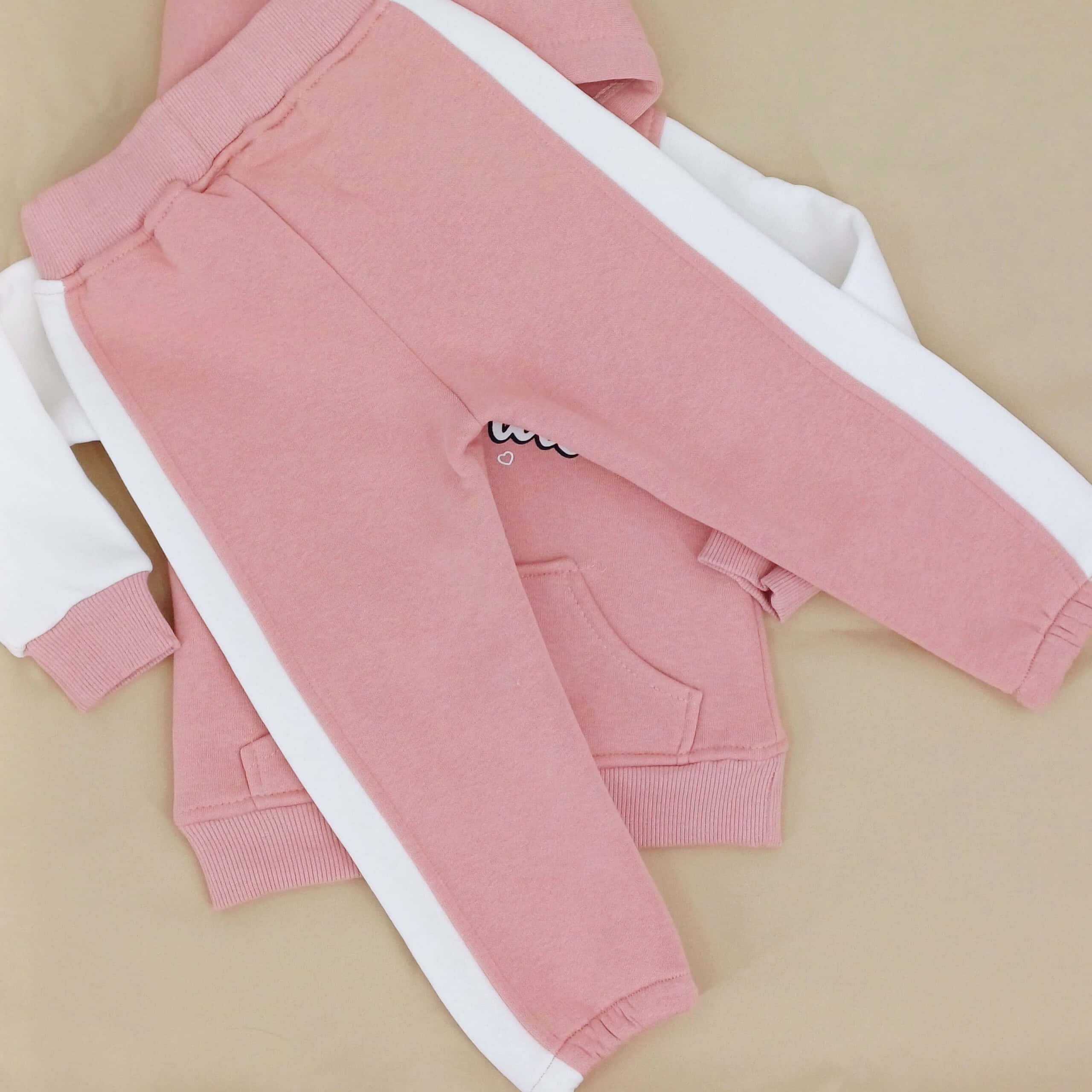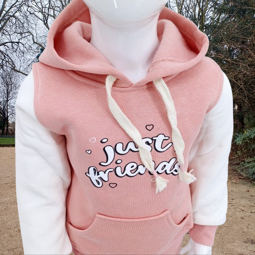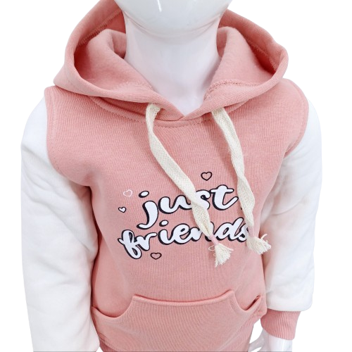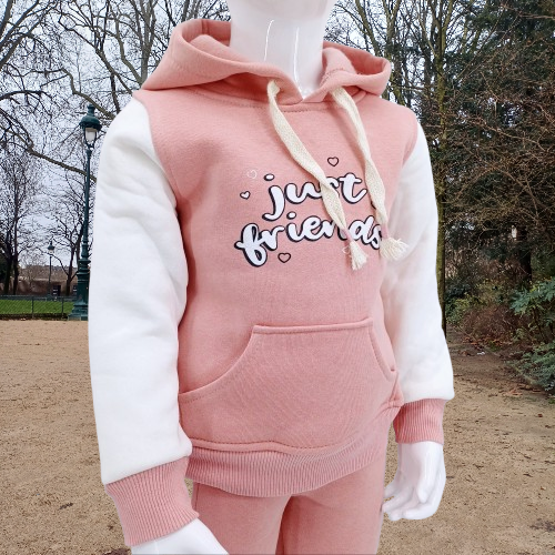 Cet ensemble d’hiver doux et chaud est parfait pour les petites filles actives ! Avec un sweat à capuche rose et blanc, arborant un motif adorable « Just Friends », et un pantalon assorti avec des bandes blanches, cet ensemble combine style et confort pour toutes les journées froides. Le sweat comporte une poche kangourou pratique et des cordons décoratifs pour un look décontracté.