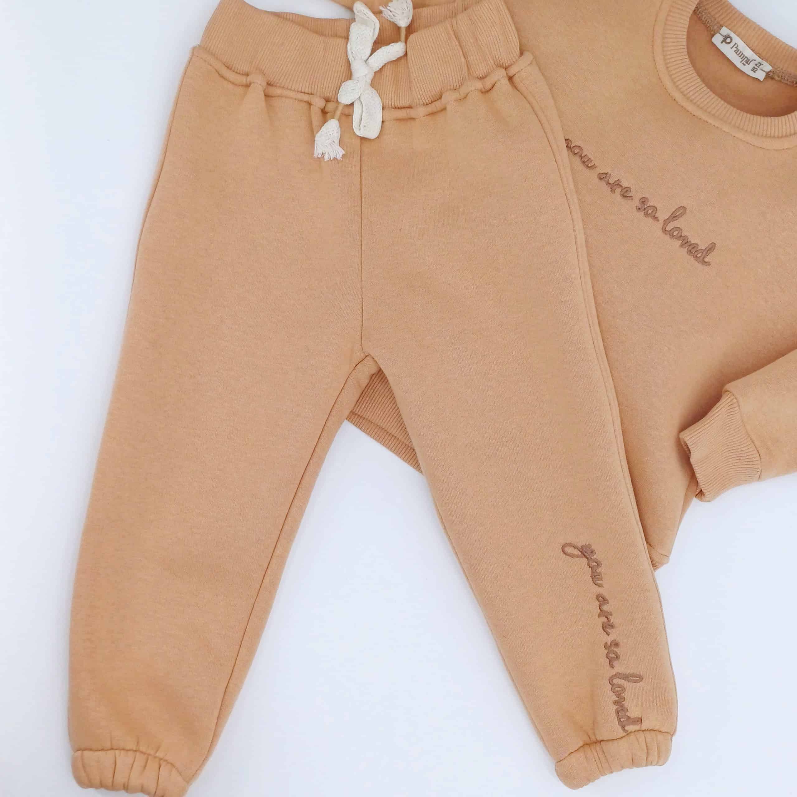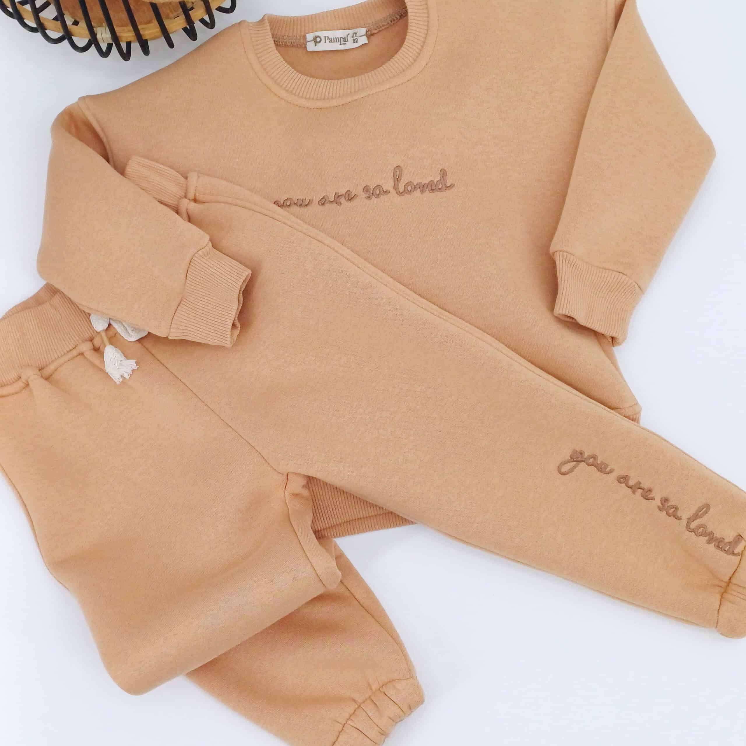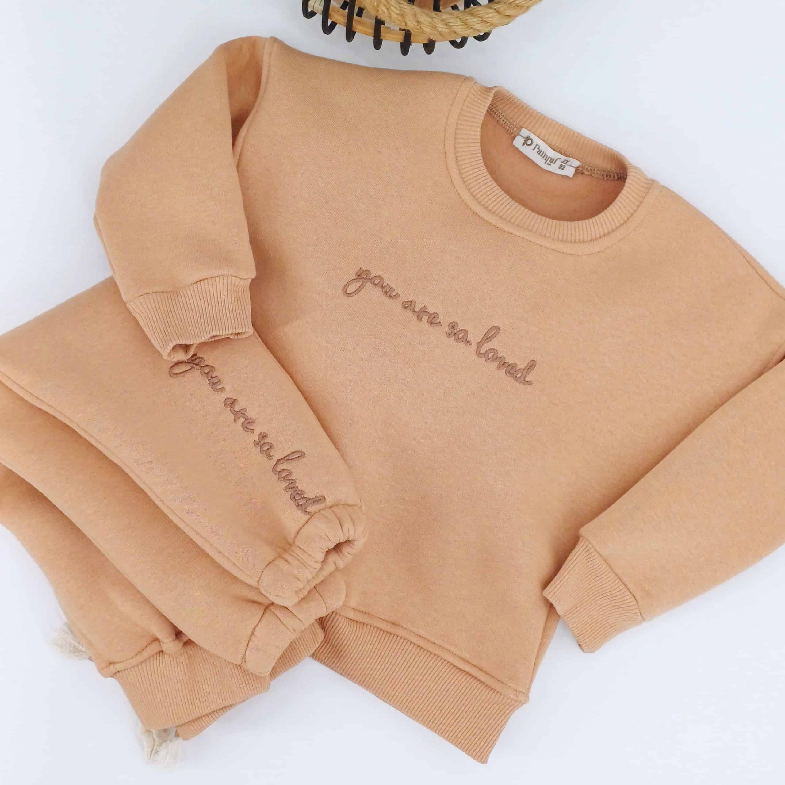 Cet ensemble hiver pour enfants, composé d’un sweat et d’un pantalon assorti, est fabriqué en 100% coton pour offrir chaleur et confort durant les mois froids. Avec le message brodé « You Are So Loved », cet ensemble doux et stylé est parfait pour les enfants de 2 à 5 ans. Son design épuré et sa couleur neutre le rendent facile à assortir, tout en ajoutant une touche de tendresse au quotidien. Disponible en tailles 2, 3, 4 et 5 ans, il est idéal pour les activités intérieures comme extérieures, offrant confort et chaleur aux tout-petits.