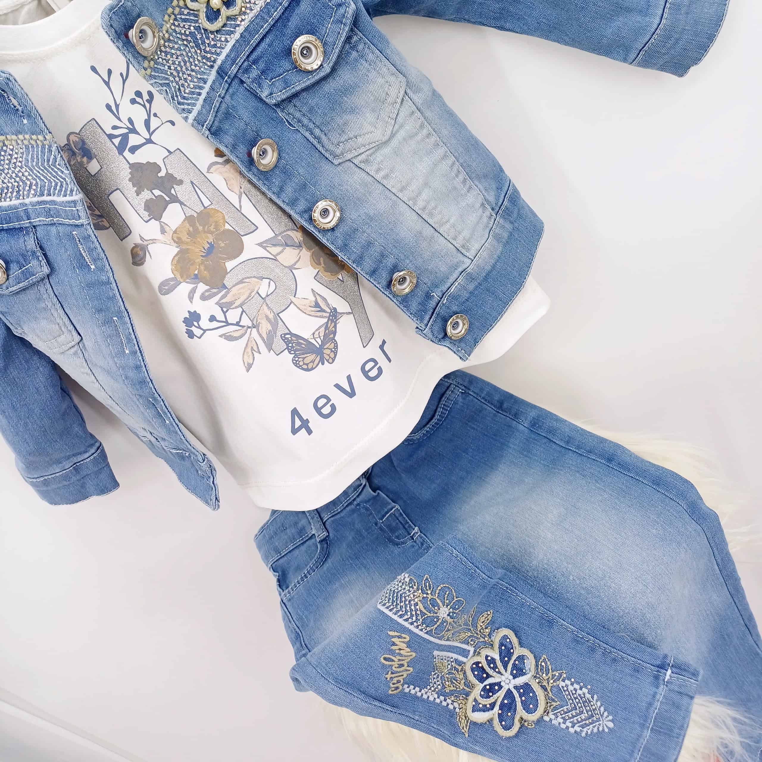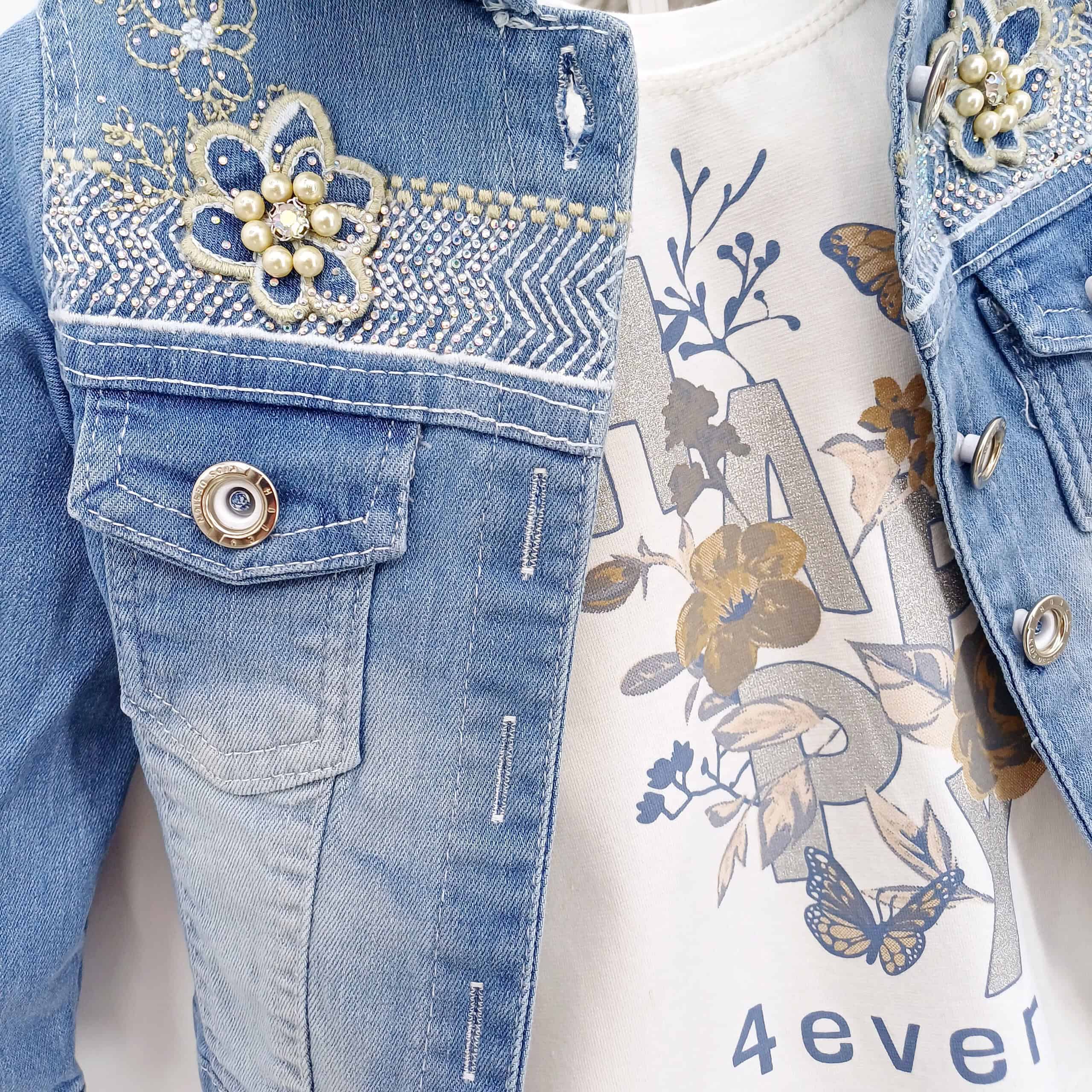 Ensemble pour fille – Veste en jean brodée, t-shirt imprimé et pantalon en jean (2-5 ans)