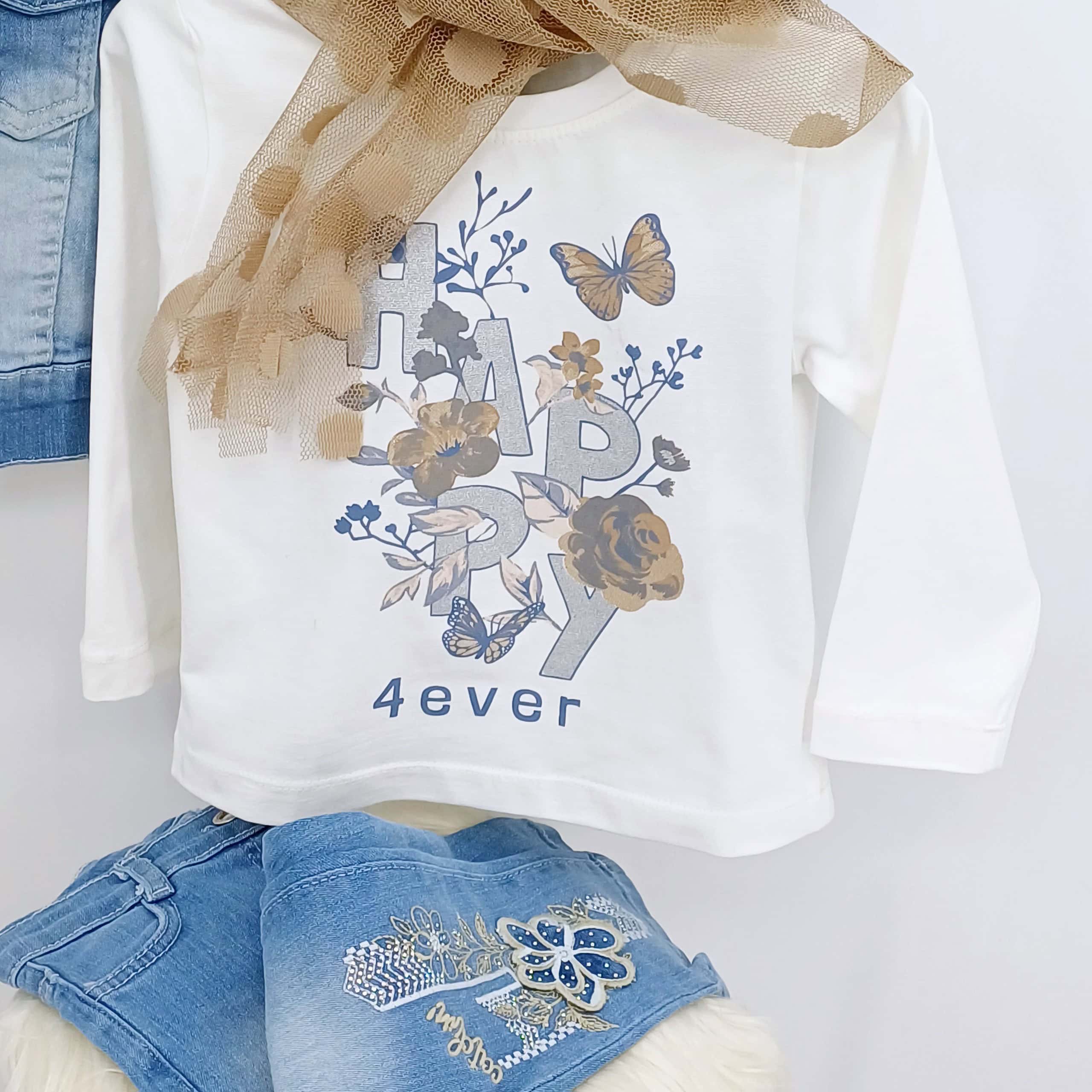 Découvrez cet ensemble élégant pour fille, parfait pour l’hiver, composé d’une superbe veste en jean ornée de broderies florales et de perles, d’un t-shirt blanc à manches longues avec un imprimé floral et le mot « Happy 4ever », ainsi qu’un pantalon en jean assorti avec des détails brodés. Cet ensemble est conçu pour les filles de 2 à 5 ans et offre un look chic et tendance. Fabriqué à partir de 95 % de coton et 5 % de polyester, il garantit confort, chaleur et style.