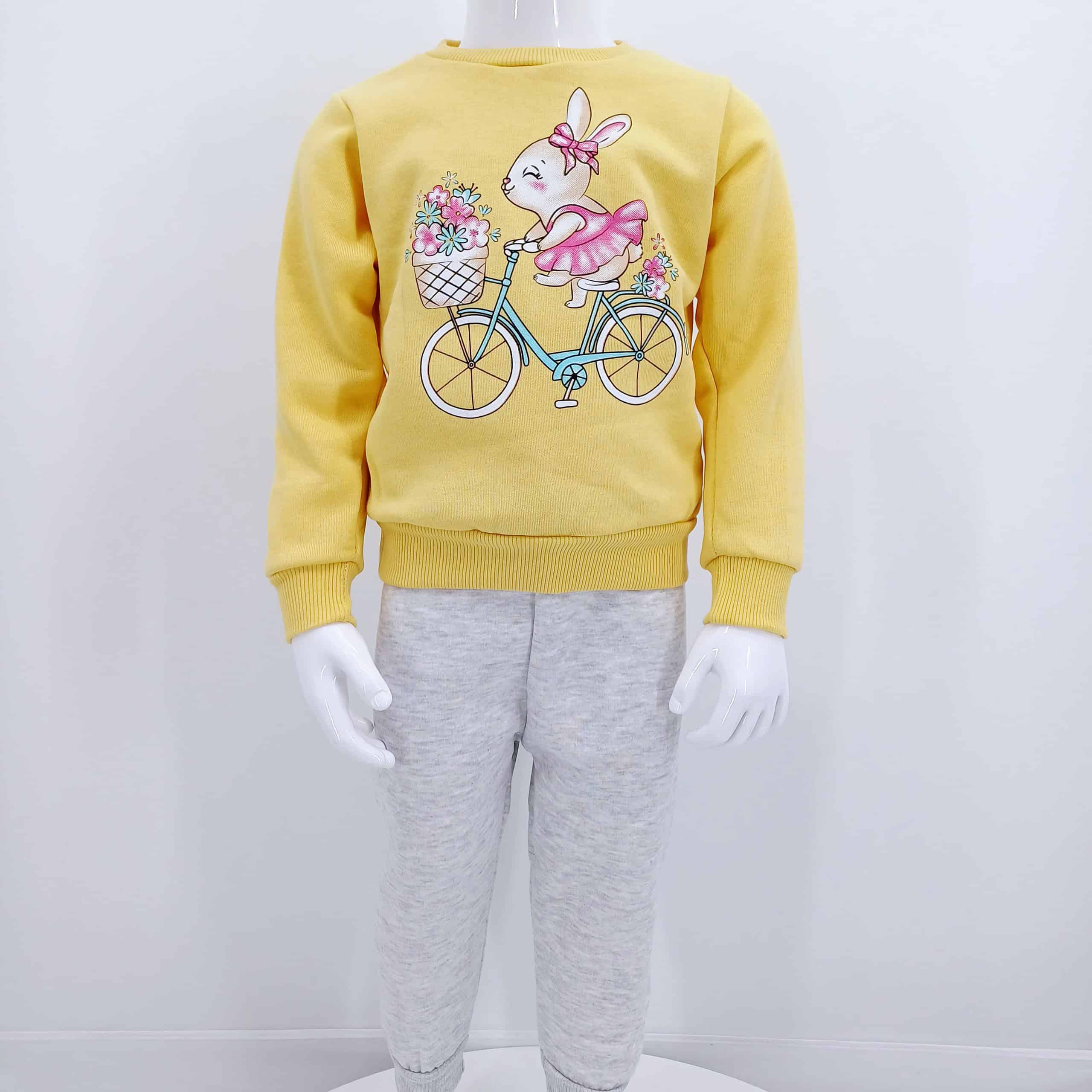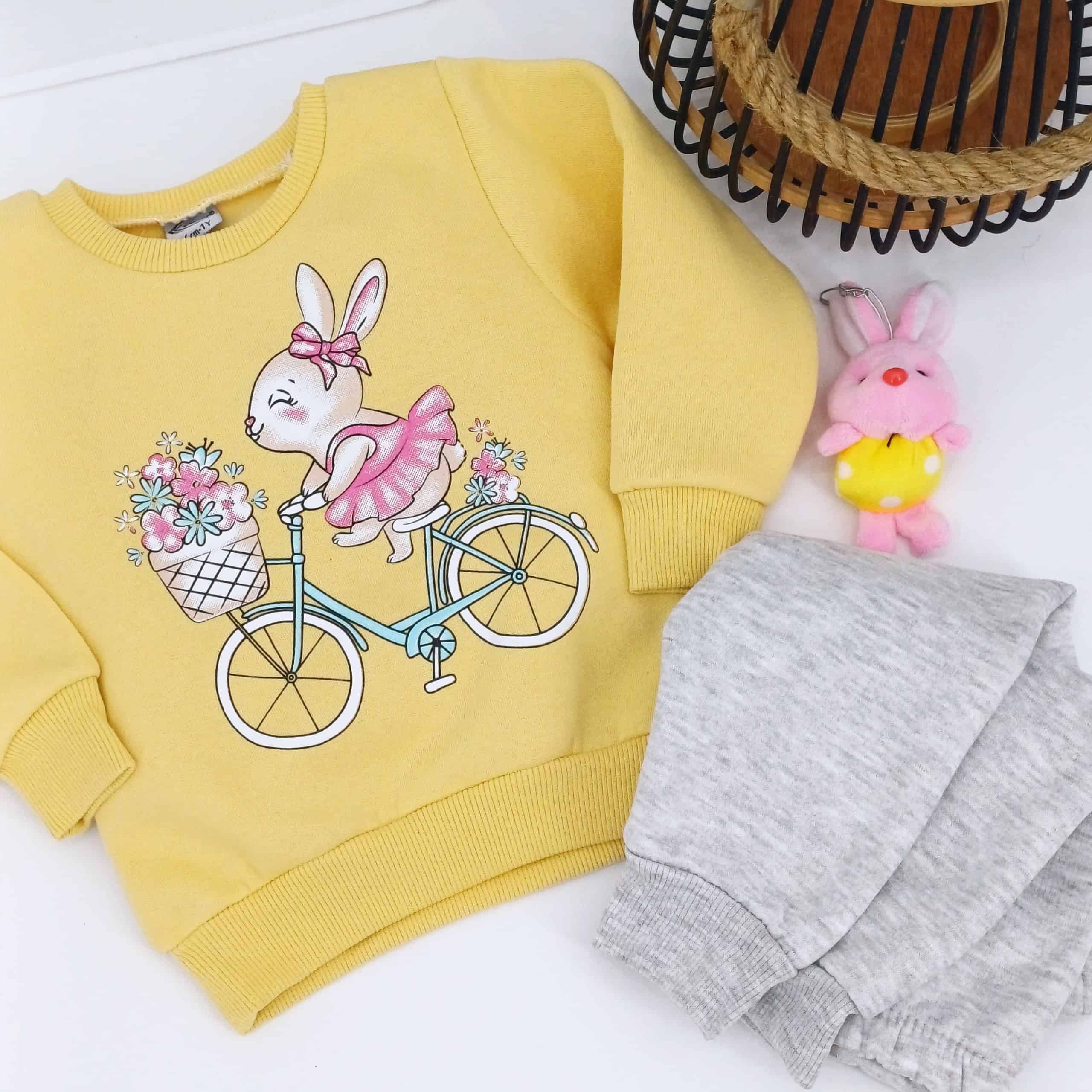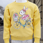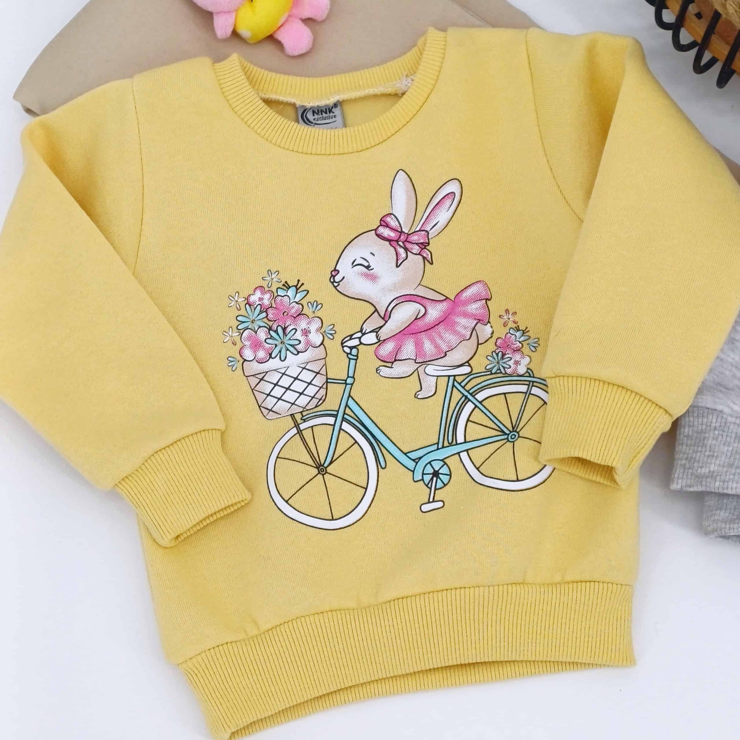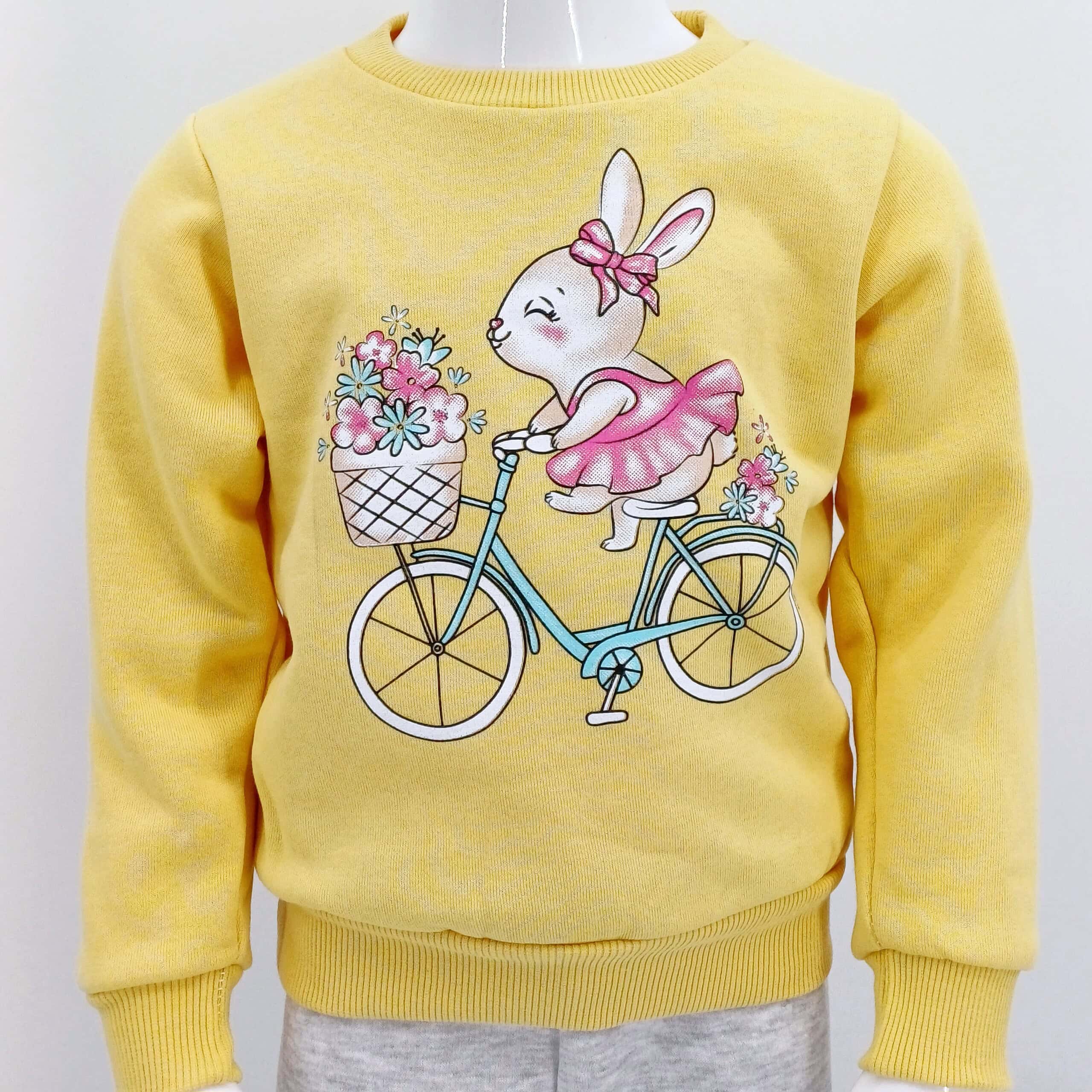 Un haut parfait pour l’hiver ! Ce sweat-shirt jaune à motif de lapin en robe rose sur un vélo fleuri est aussi doux qu’il est craquant. Son tissu molletonné garde votre enfant au chaud, tandis que la coupe confortable offre une grande liberté de mouvement. C’est la pièce coup de cœur pour toutes les petites aventurières de 1 à 4 ans.
