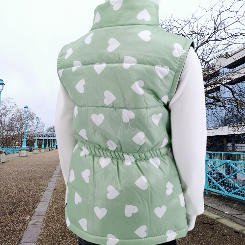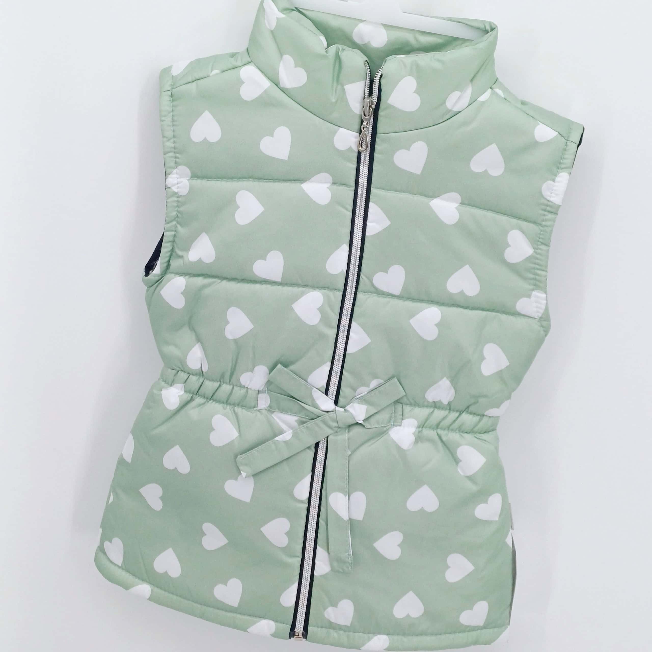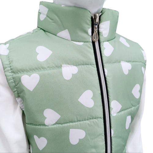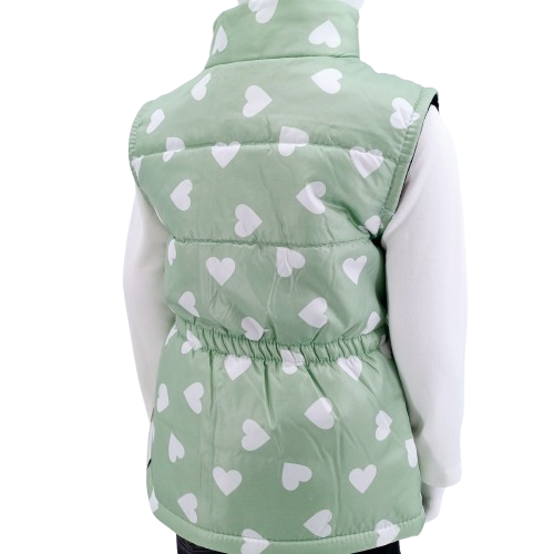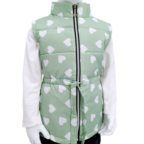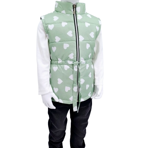 Ce charmant gilet matelassé sans manches est parfait pour les filles de 3 à 5 ans. Avec son motif de coeurs blancs sur fond vert pastel et sa ceinture décorative avec nœud à la taille, il offre un look adorable et stylé. Léger mais chaud, il est idéal pour les journées fraîches d’automne et de printemps, permettant à votre enfant de rester confortable tout en ajoutant une touche de style à sa tenue. Fermeture zippée pratique pour un enfilage facile.