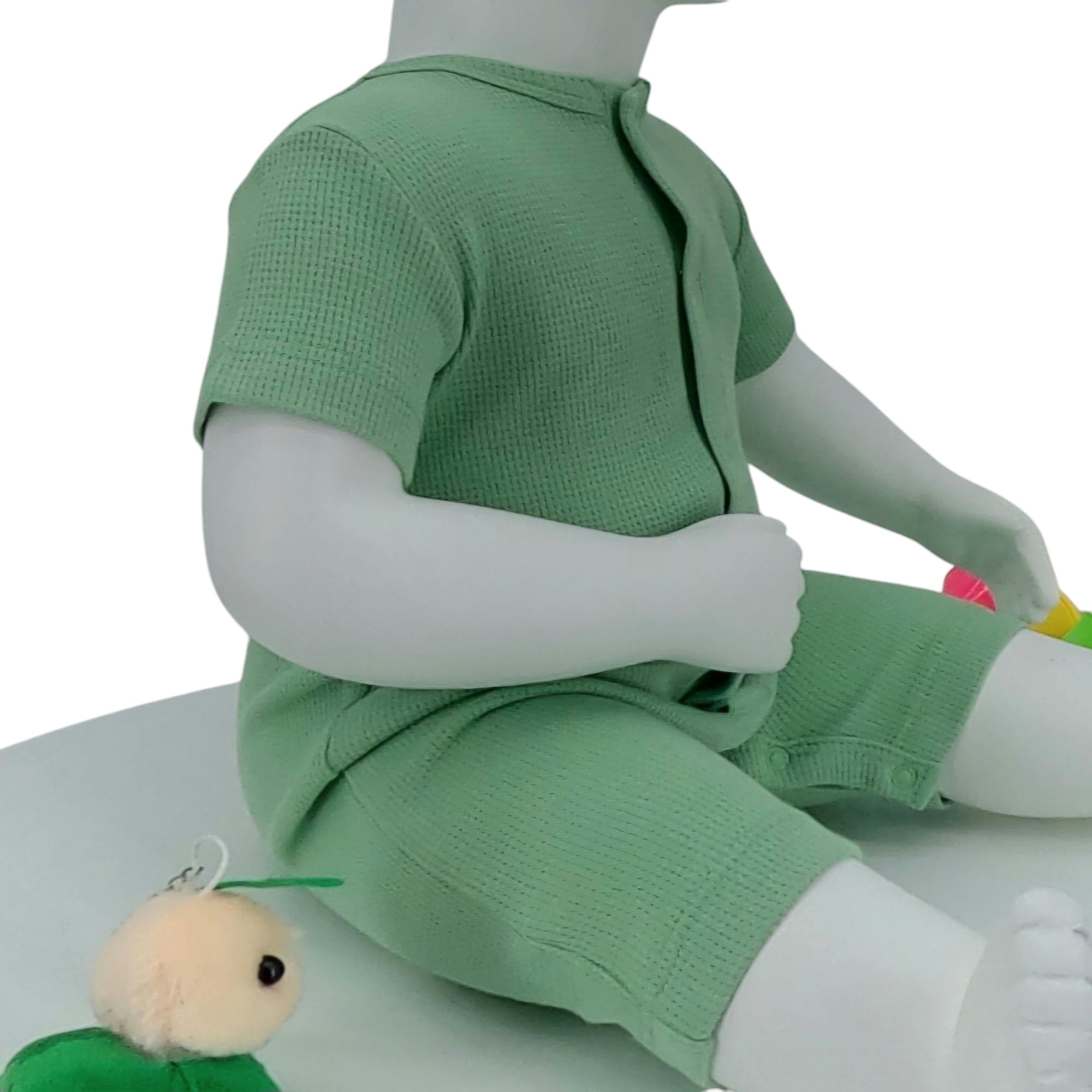 Voici Lutin Menthe, une barboteuse pleine de fraîcheur, pensée pour les bébés curieux, libres de bouger et de respirer à leur rythme.