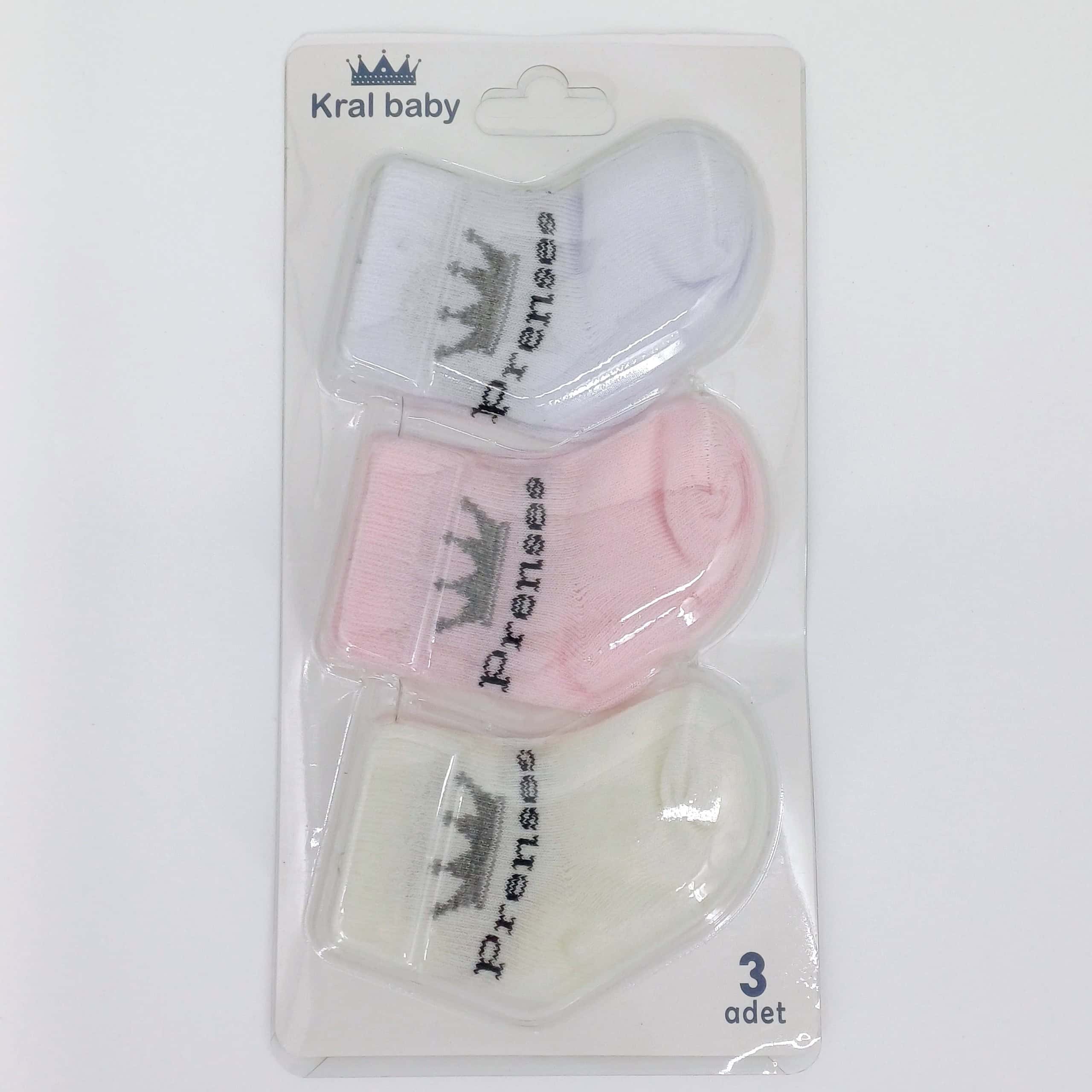 Lot de 3 paires de chaussettes pour nouveau-né, idéal pour garder les petits pieds de bébé au chaud et confortables. Ces chaussettes sont ornées d’un motif « Prenses » avec une petite couronne, ajoutant une touche élégante et mignonne. Les chaussettes sont disponibles en trois couleurs douces : blanc, rose et crème, parfaites pour les petites princesses. Fabriquées en coton doux, elles assurent une sensation agréable sur la peau délicate de bébé et sont idéales dès la naissance.