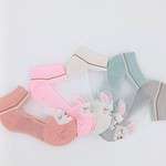 Lot de 5 paires de chaussettes pour fille de 1 à 2 ans avec des motifs adorables de petits lapins brodés. Les chaussettes sont disponibles dans des tons pastel doux, apportant une touche de tendresse et de style aux tenues des petites filles. Fabriquées en matière respirante et douce, elles sont conçues pour offrir un confort optimal tout au long de la journée.