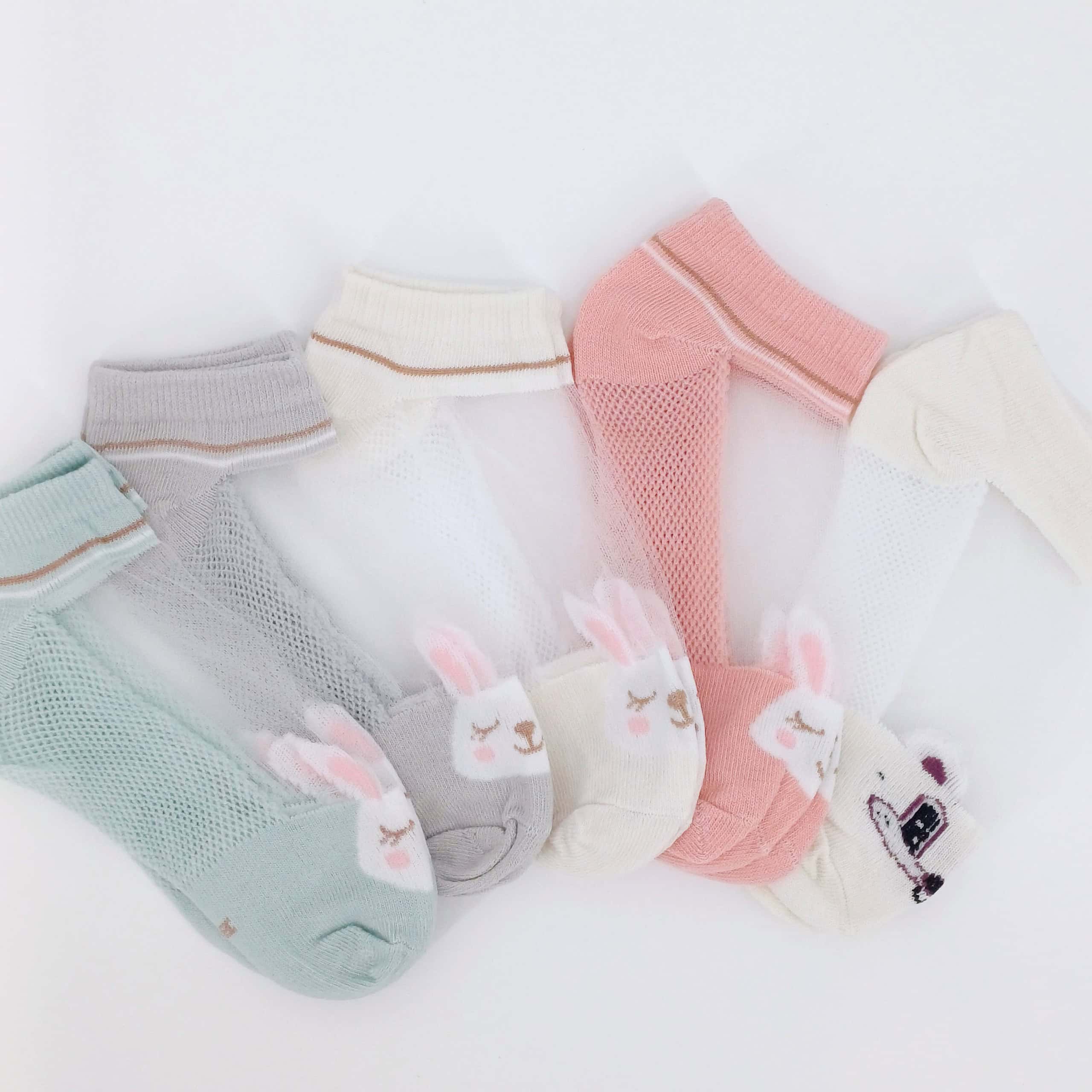 Lot de 5 paires de chaussettes pour fille de 2 à 3 ans avec des motifs adorables de petits lapins brodés. Les chaussettes sont disponibles dans des tons pastel doux comme le vert, le gris, le blanc, le rose et le beige, apportant une touche de tendresse et de style aux tenues des petites filles. Fabriquées en matière respirante et douce, elles sont conçues pour offrir un confort optimal tout au long de la journée.