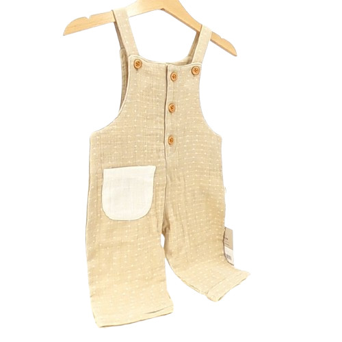 Salopette beige à pois en coton bio, ultra douce et unisexe. Poche crème, boutons bois, confort total pour bébé de 3 à 24 mois.