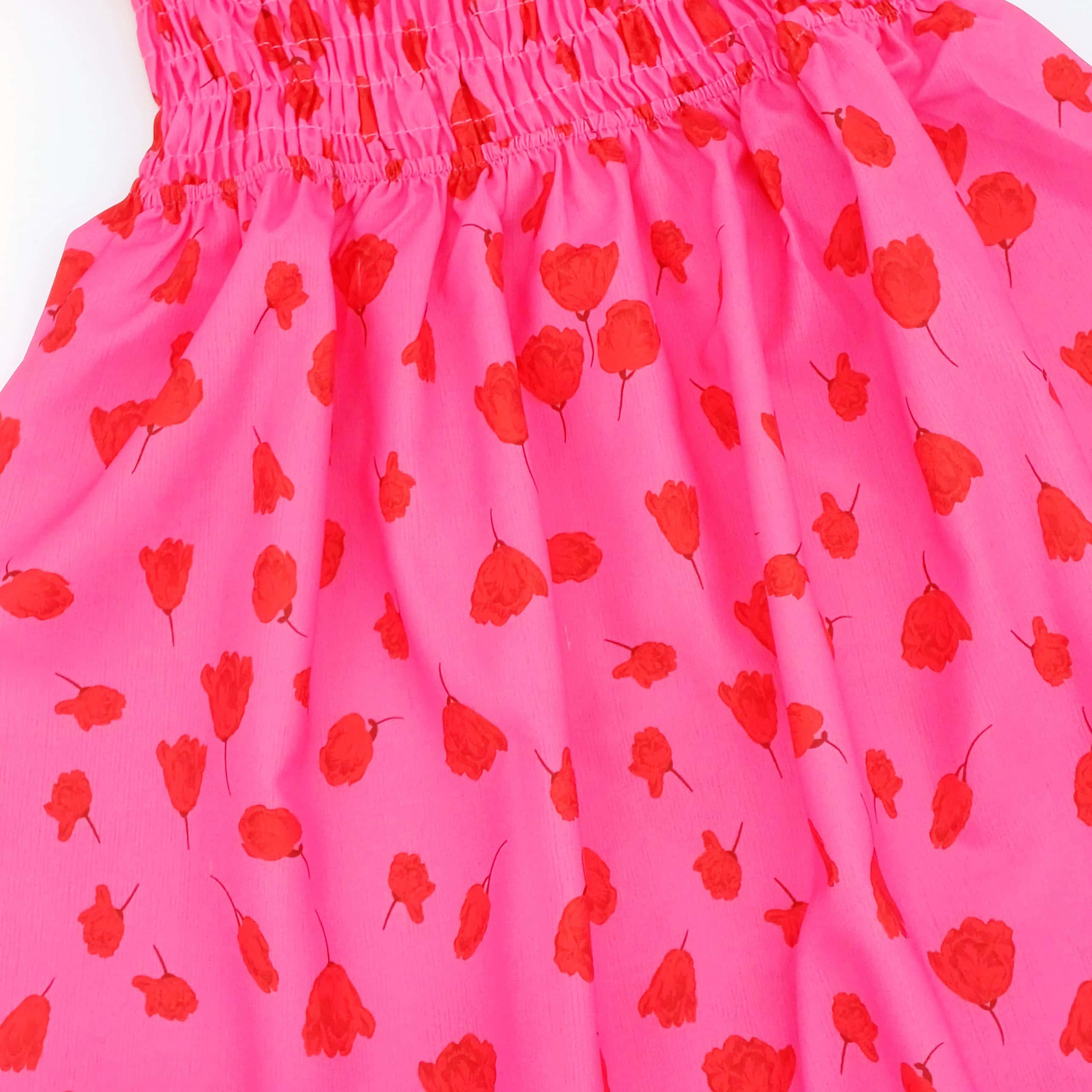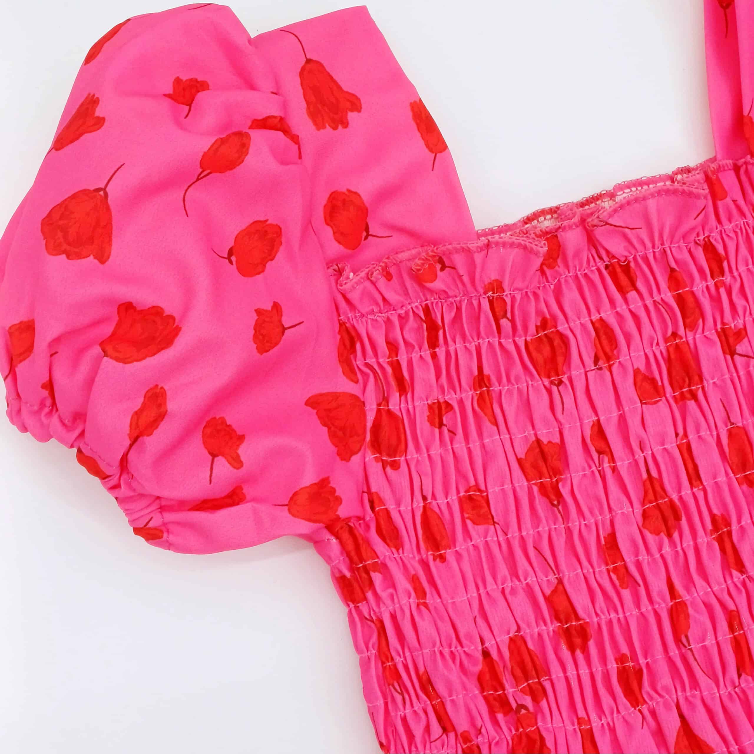 Une jolie robe pour petite fille, conçue pour être à la fois élégante et confortable. La robe est de couleur rose vif avec des motifs de fleurs rouges, créant un effet visuel charmant et féminin. Le haut de la robe est froncé avec un élastique, offrant un ajustement flexible et confortable, tandis que les manches bouffantes ajoutent une touche de douceur et de style. Idéale pour les occasions spéciales ou pour un look quotidien mignon, cette robe est parfaite pour les petites filles qui aiment la couleur et les motifs floraux.