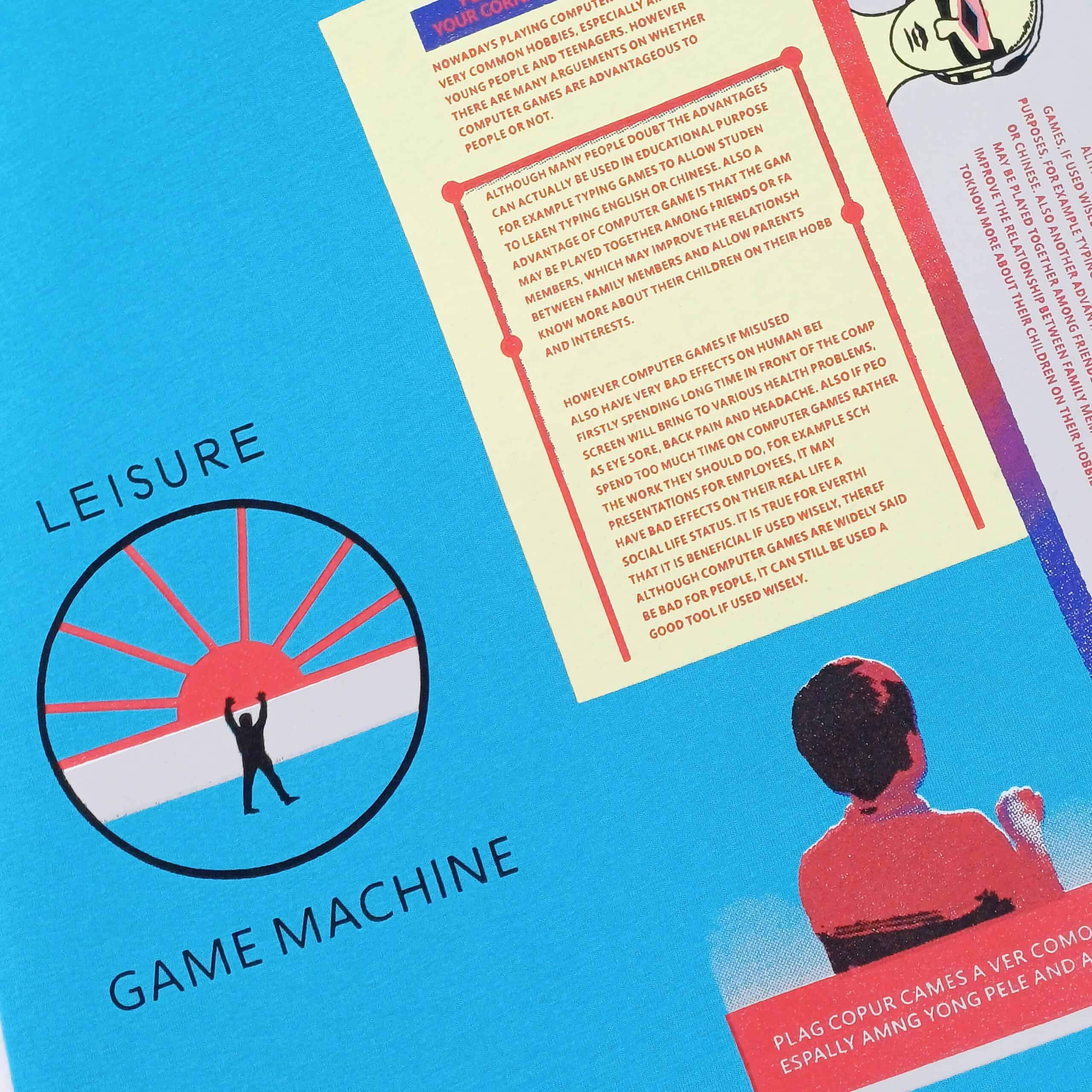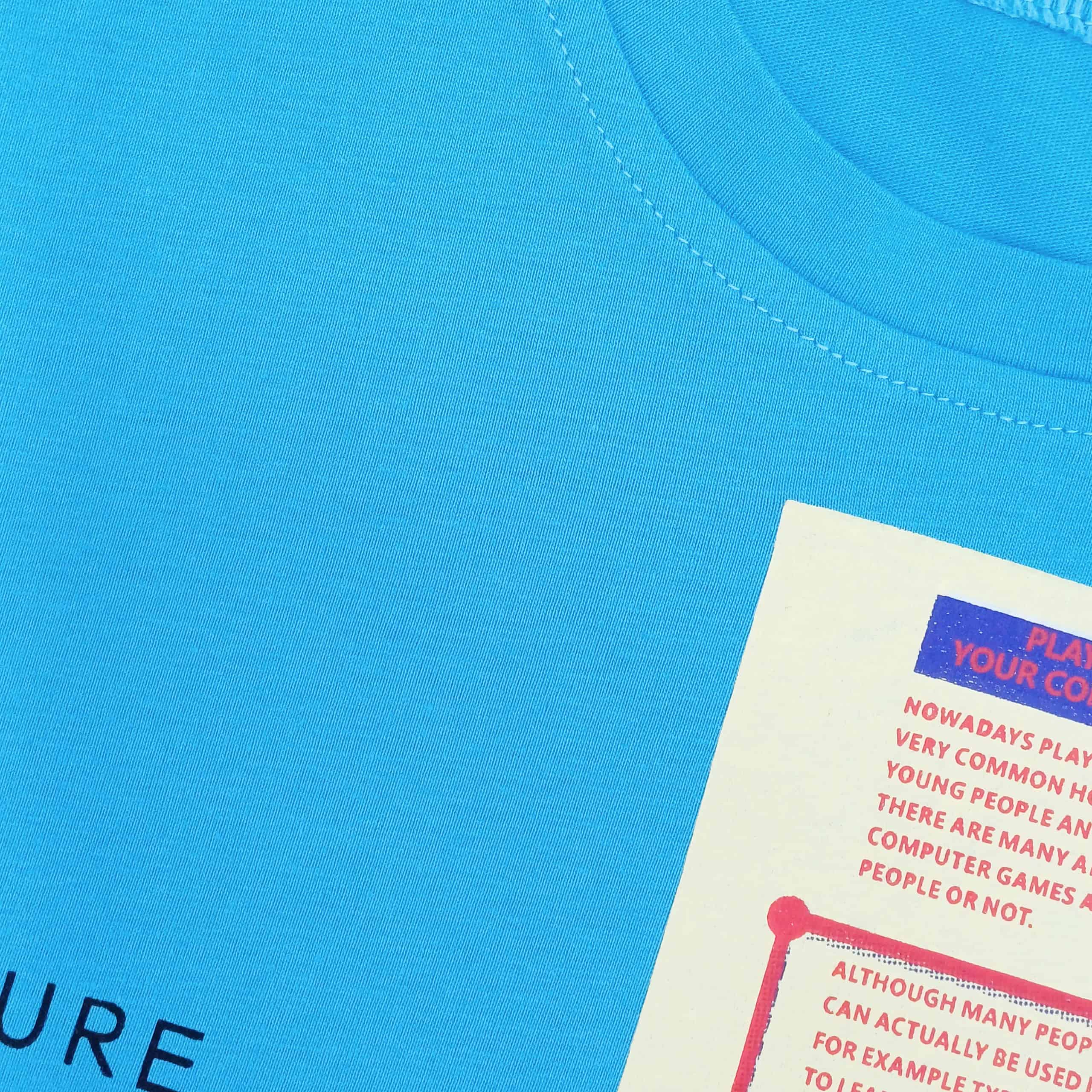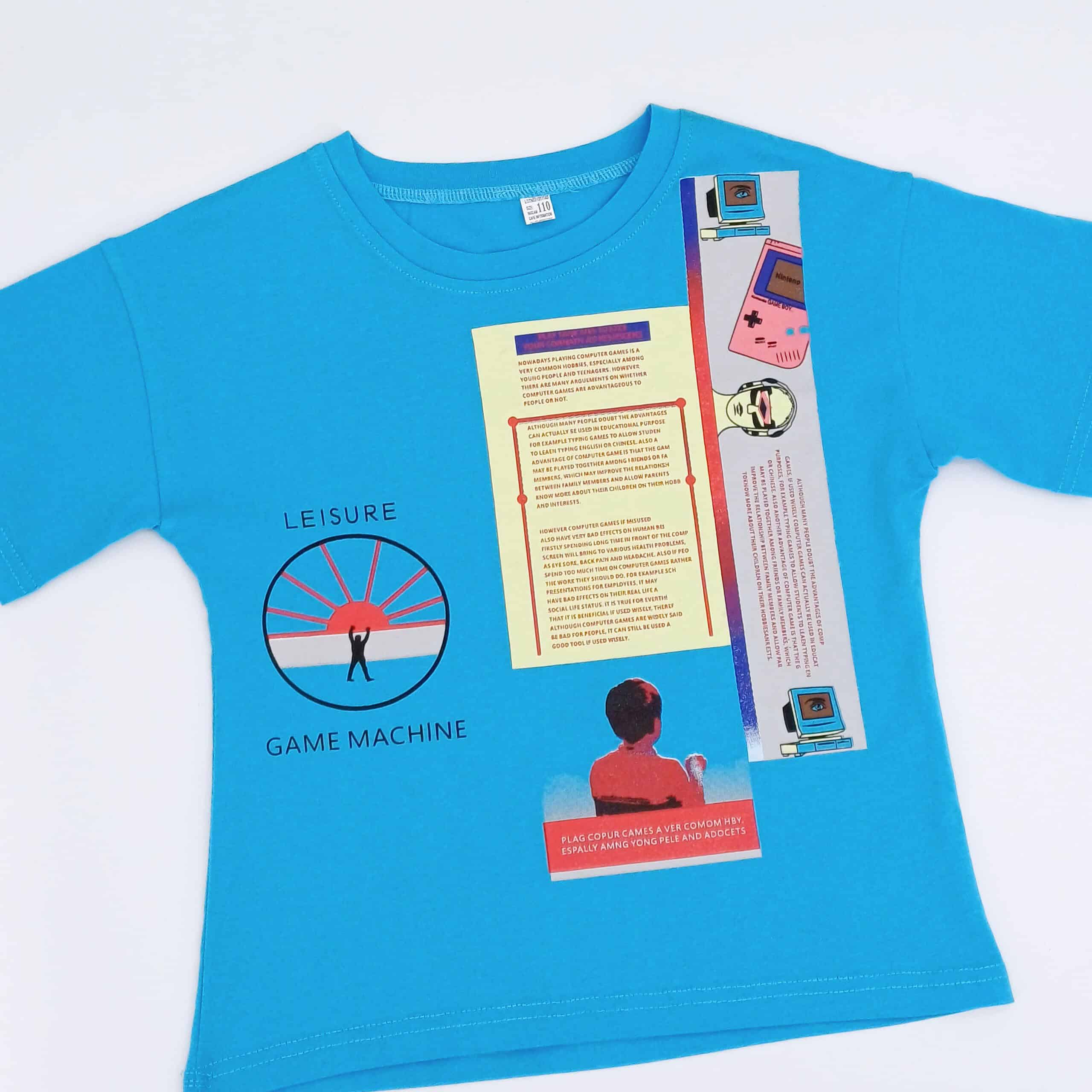 T-shirt bleu pour petits gamers, conçu pour les enfants de 2 à 4 ans. Le design est inspiré des jeux rétro et comprend des illustrations de console de jeu portable et d’un ancien ordinateur. Le t-shirt présente des inscriptions en rapport avec le thème des jeux et des loisirs, telles que « Leisure Game Machine », ainsi qu’un texte sur l’impact des jeux vidéo. Le style graphique rappelle l’atmosphère des anciens jeux vidéo, en combinant du texte et des icônes de jeu, ce qui peut plaire aux jeunes gamers et à leurs parents qui apprécient la culture du rétro-gaming.